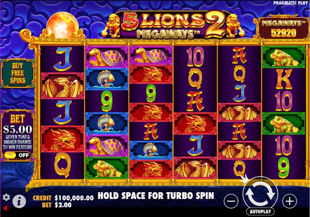 The visual presentation of 5 Lions Megaways 2 transports players into an opulent world of Chinese imperial artistry. Against a deep royal blue backdrop adorned with flowing cloud motifs, the game’s 6-reel grid is framed by ornate golden pillars featuring traditional Chinese architectural elements. Each symbol position is highlighted by vibrant colored frames with intricate geometric patterns, creating a visually striking layout that enhances the game’s dynamic Megaways mechanics.