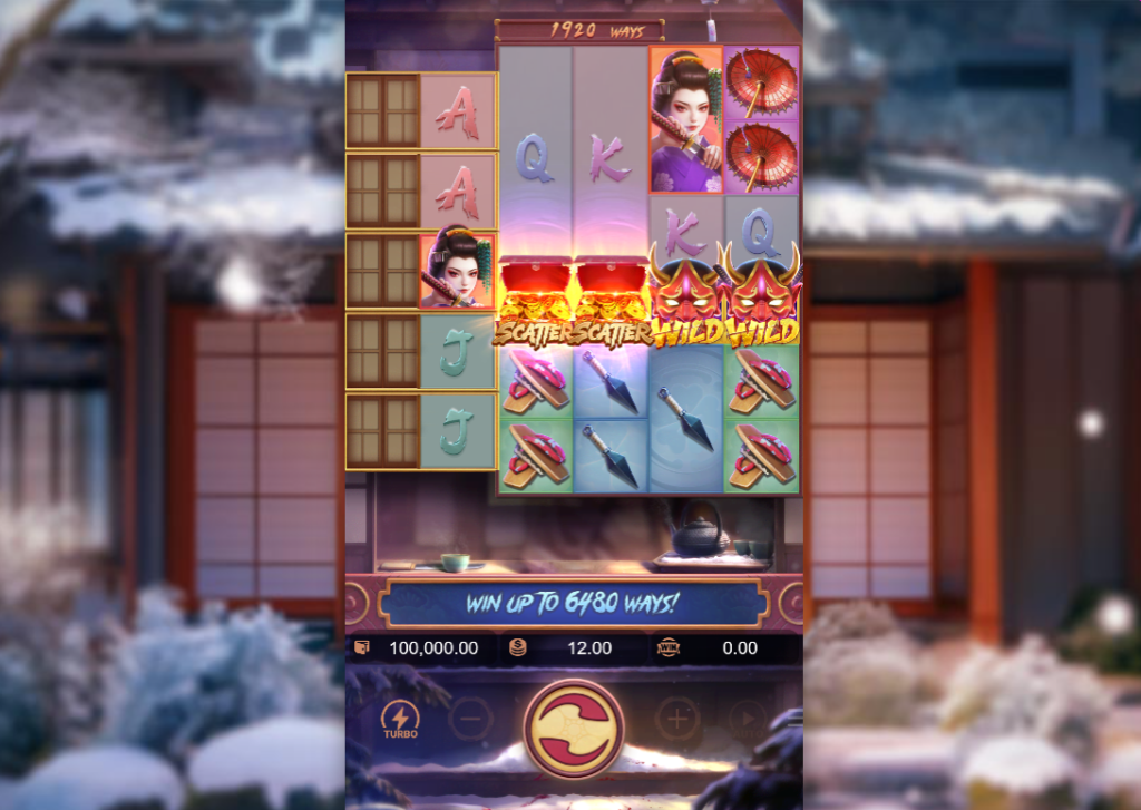 PG Soft has crafted an atmospheric gaming experience set against the backdrop of a traditional Japanese teahouse. The game’s visual presentation cleverly incorporates both dramatic and serene elements, with the reels floating above a tranquil scene featuring traditional shōji sliding doors and a peaceful garden setting visible in the soft-focused background.