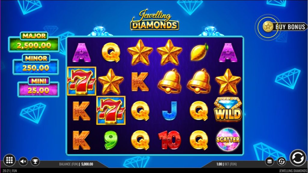Iron Dog Studios has crafted a visually striking atmosphere in Jewelling Diamonds, setting the action against a deep purple backdrop adorned with glowing blue diamond silhouettes. The game grid features a harmonious blend of classic and premium symbols, each rendered with meticulous attention to detail. The premium symbols include traditional lucky sevens framed in bold blue borders and gleaming golden stars, while the classic slot elements are represented by golden bells and citrus fruits. Playing card symbols from 9 to A complete the regular symbol set, each designed with unique textures and colors that complement the game’s luxurious theme.